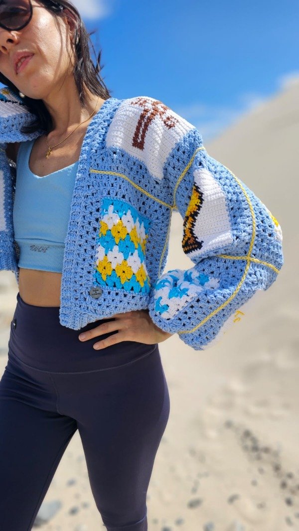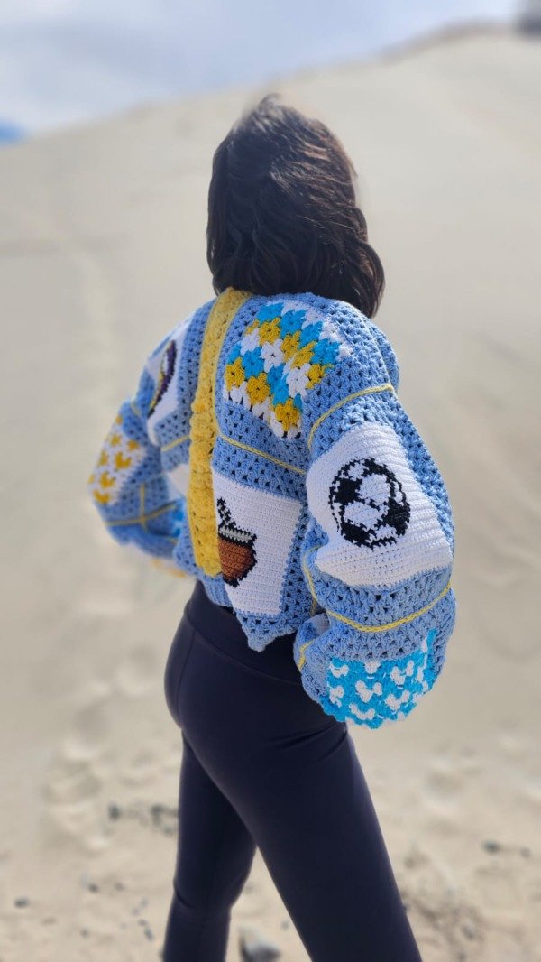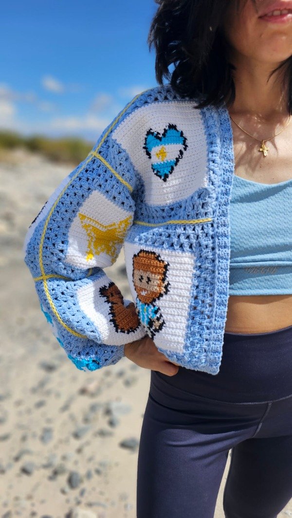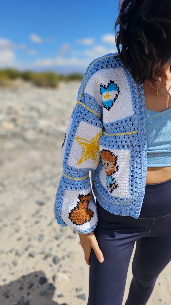 Esta guía te permite tejer el Saco Argentina, un diseño original que combina símbolos icónicos —mate, Messi, estrellas, copa, paz y conexión espiritual— en una pieza moderna, expresiva y totalmente atemporal.